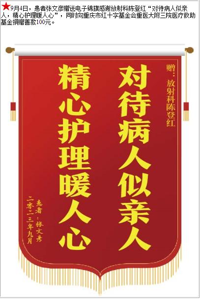 患者张文彦赠送电子锦旗感谢放射科陈登红,并向医疗救助基金捐赠善款100元-锦旗-患者心声-患者服务-重庆医科大学附属第三医院【官方网站】