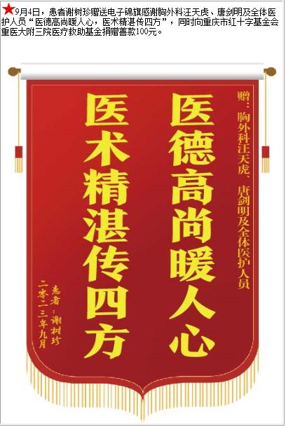患者谢树珍赠送电子锦旗感谢胸外科汪天虎等人及全体医护人员,并向医疗救助基金捐赠善款100元-锦旗-患者心声-患者服务-重庆医科大学附属第三医院【官方网站】