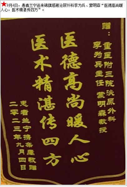 患者兰宁送来锦旗感谢泌尿外科李为兵、蒙明森“医德高尚暖人心,医术精湛传四方”-锦旗-患者心声-患者服务-重庆医科大学附属第三医院【官方网站】