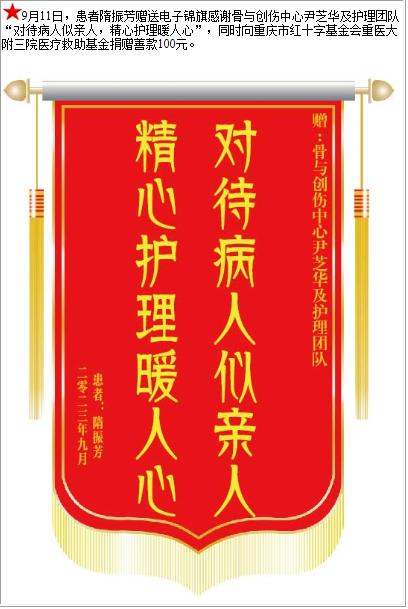 患者隋振芳赠送电子锦旗感谢骨与创伤中心尹芝华及护理团队,并向医疗救助基金捐赠善款100元-锦旗-患者心声-患者服务-重庆医科大学附属第三医院【官方网站】