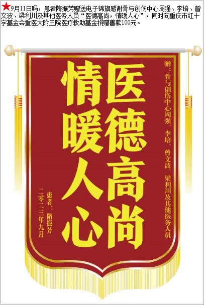 患者隋振芳赠送电子锦旗感谢骨与创伤中心周强等人,并向医疗救助基金捐赠善款100元-锦旗-患者心声-患者服务-重庆医科大学附属第三医院【官方网站】