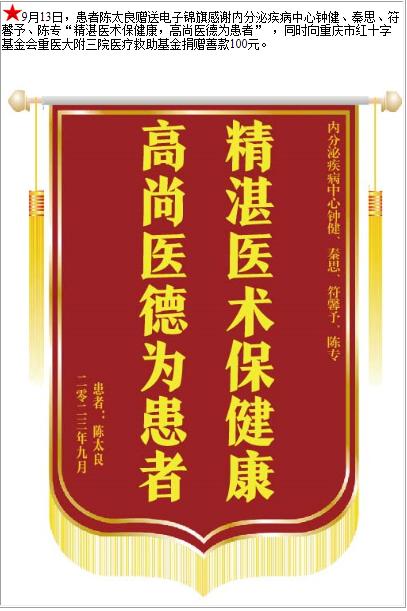 患者陈太良赠送电子锦旗感谢内分泌疾病中心钟健等人 ,并向医疗救助基金捐赠善款100元-锦旗-患者心声-患者服务-重庆医科大学附属第三医院【官方网站】