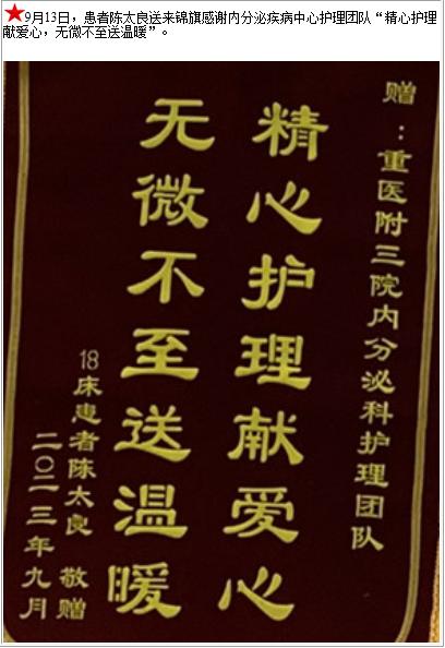 患者陈太良送来锦旗感谢内分泌疾病中心护理团队“精心护理献爱心,无微不至送温暖”-锦旗-患者心声-患者服务-重庆医科大学附属第三医院【官方网站】