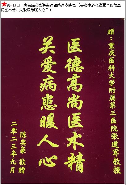患者陈奕豪送来锦旗感谢皮肤/整形美容中心张道军“医德高尚医术精,关爱病患暖人心”-锦旗-患者心声-患者服务-重庆医科大学附属第三医院【官方网站】