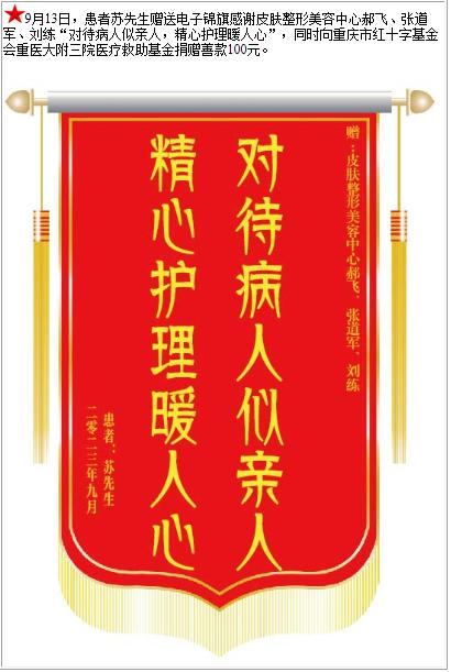 患者苏先生赠送电子锦旗感谢皮肤整形美容中心郝飞等人,并向医疗救助基金捐赠善款100元-锦旗-患者心声-患者服务-重庆医科大学附属第三医院【官方网站】