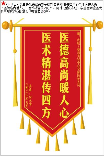 患者任永秀赠送电子锦旗皮肤/整形美容中心全体医护人员,并向医疗救助基金捐赠善款100元-锦旗-患者心声-患者服务-重庆医科大学附属第三医院【官方网站】