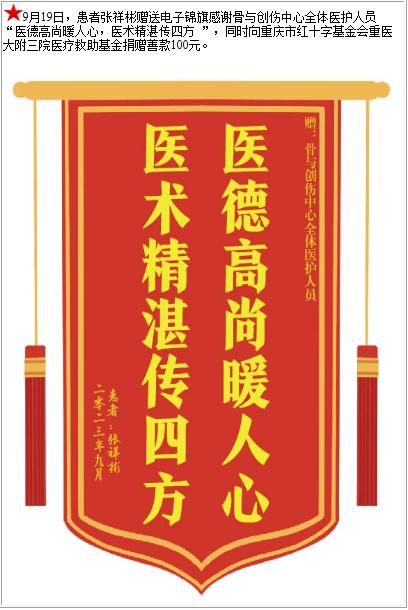患者张祥彬赠送电子锦旗感谢骨与创伤中心全体医护人员,并向医疗救助基金捐赠善款100元-锦旗-患者心声-患者服务-重庆医科大学附属第三医院【官方网站】
