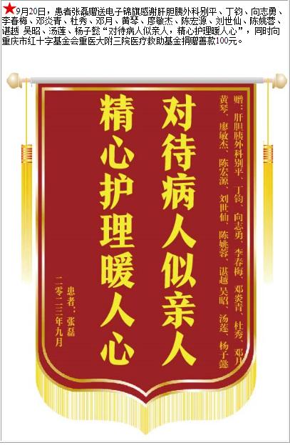 患者张磊赠送电子锦旗感谢肝胆胰外科别平等人,并向医疗救助基金捐赠善款100元-锦旗-患者心声-患者服务-重庆医科大学附属第三医院【官方网站】