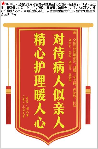 患者胡永菊赠送电子锦旗感谢心血管外科谢徐萍等人,并向医疗救助基金捐赠善款100元-锦旗-患者心声-患者服务-重庆医科大学附属第三医院【官方网站】