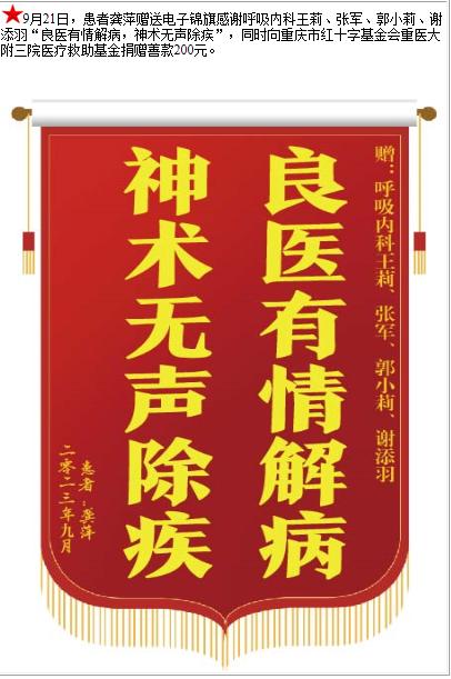 患者龚萍赠送电子锦旗感谢呼吸内科王莉等人,并向医疗救助基金捐赠善款200元-锦旗-患者心声-患者服务-重庆医科大学附属第三医院【官方网站】