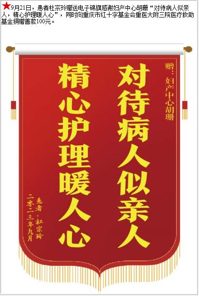 患者杜宗玲赠送电子锦旗感谢妇产中心胡珊,并向医疗救助基金捐赠善款100元-锦旗-患者心声-患者服务-重庆医科大学附属第三医院【官方网站】