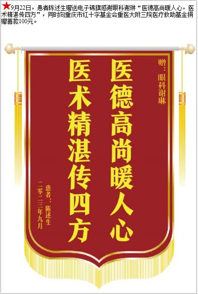 患者陈述生赠送电子锦旗感谢眼科谢琳,并向医疗救助基金捐赠善款100元-锦旗-患者心声-患者服务-重庆医科大学附属第三医院【官方网站】