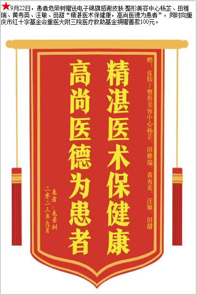 患者危荣树赠送电子锦旗感谢皮肤/整形美容中心杨芷等人,同时向医疗救助基金捐赠善款100元-锦旗-患者心声-患者服务-重庆医科大学附属第三医院【官方网站】