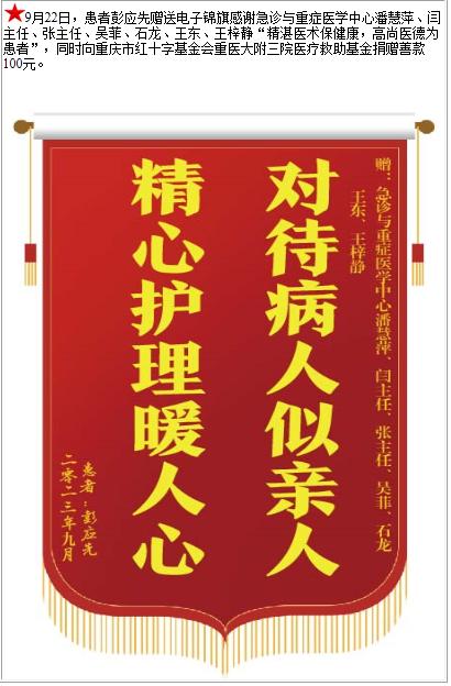患者彭应先赠送电子锦旗感谢急诊与重症医学中心潘慧萍等人,并向医疗救助基金捐赠善款100元-锦旗-患者心声-患者服务-重庆医科大学附属第三医院【官方网站】