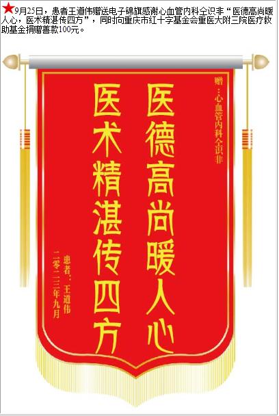 患者王道伟赠送电子锦旗感谢心血管内科仝识非,并向医疗救助基金捐赠善款100元-锦旗-患者心声-患者服务-重庆医科大学附属第三医院【官方网站】
