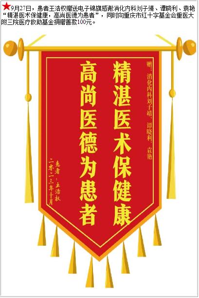 患者王浩权赠送电子锦旗感谢消化内科刘子靖等人,并向医疗救助基金捐赠善款100元-锦旗-患者心声-患者服务-重庆医科大学附属第三医院【官方网站】