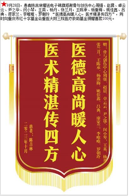 患者陈吉林赠送电子锦旗感谢骨与创伤中心周强等人,并向医疗救助基金捐赠善款100元-锦旗-患者心声-患者服务-重庆医科大学附属第三医院【官方网站】