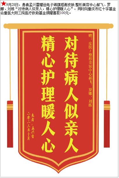患者孟兴雷赠送电子锦旗感谢皮肤/整形美容中心郝飞等人,并向医疗救助基金捐赠善款100元-锦旗-患者心声-患者服务-重庆医科大学附属第三医院【官方网站】