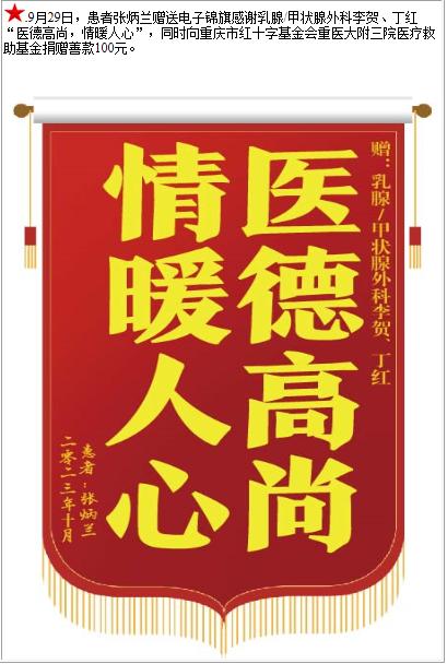 患者张炳兰赠送电子锦旗感谢乳腺/甲状腺外科李贺等人,并向医疗救助基金捐赠善款100元-锦旗-患者心声-患者服务-重庆医科大学附属第三医院【官方网站】