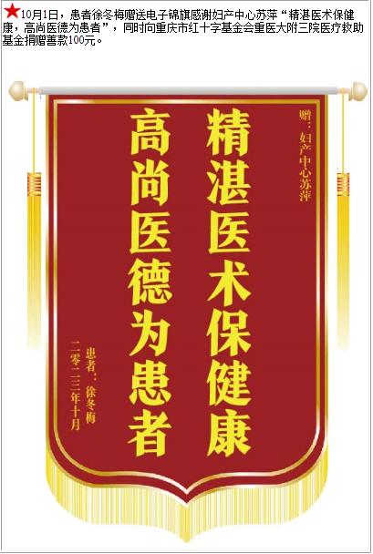 患者徐冬梅赠送电子锦旗感谢妇产中心苏萍,并向医疗救助基金捐赠善款100元-锦旗-患者心声-患者服务-重庆医科大学附属第三医院【官方网站】