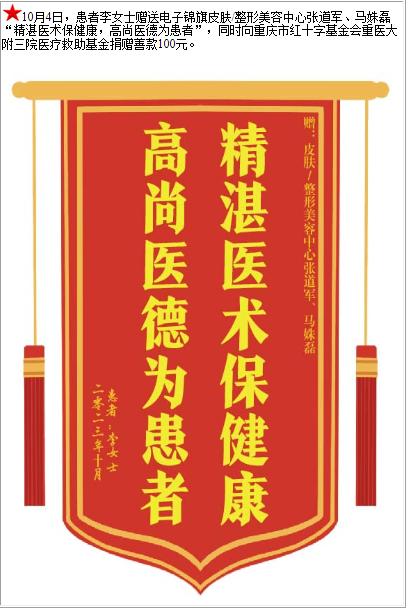 患者李女士赠送电子锦旗皮肤/整形美容中心张道军等人,并向医疗救助基金捐赠善款100元-锦旗-患者心声-患者服务-重庆医科大学附属第三医院【官方网站】