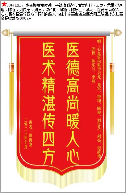 患者郑海龙赠送电子锦旗感谢心血管内科李云龙等人,并向医疗救助基金捐赠善款100元-锦旗-患者心声-患者服务-重庆医科大学附属第三医院【官方网站】