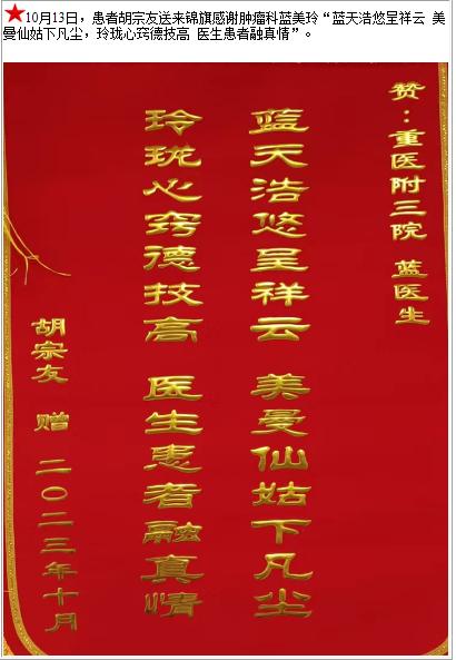 患者胡宗友送来锦旗感谢肿瘤科蓝美玲“蓝天浩悠呈祥云 美曼仙姑下凡尘,玲珑心窍德技高 医生患者融真情”-锦旗-患者心声-患者服务-重庆医科大学附属第三医院【官方网站】