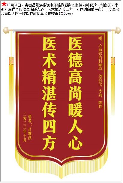 患者吕维洪赠送电子锦旗感谢心血管内科顾琦等人,并向医疗救助基金捐赠善款100元-锦旗-患者心声-患者服务-重庆医科大学附属第三医院【官方网站】