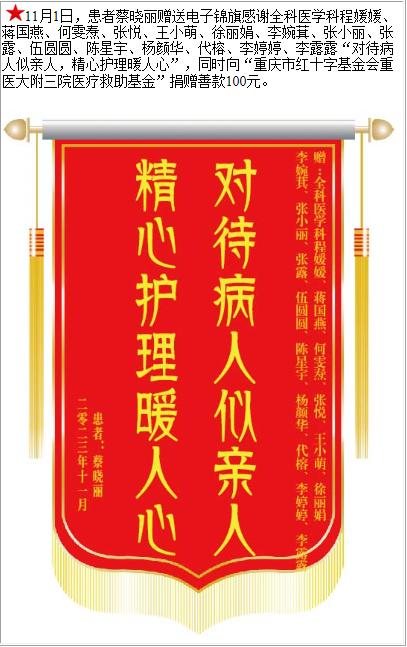患者蔡晓丽赠送电子锦旗感谢全科医学科程媛媛等人,并向医疗救助基金捐赠善款100元-锦旗-患者心声-患者服务-重庆医科大学附属第三医院【官方网站】