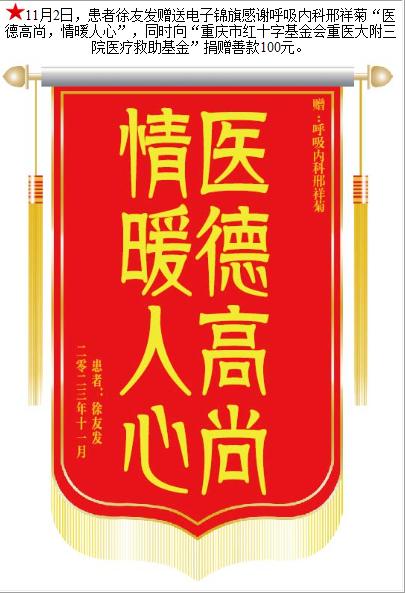 患者徐友发赠送电子锦旗感谢呼吸内科邢祥菊,并向医疗救助基金捐赠善款100元-锦旗-患者心声-患者服务-重庆医科大学附属第三医院【官方网站】