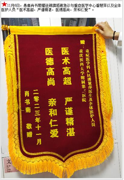 11月6日,患者肖书菊赠送锦旗感谢急诊与重症医学中心潘慧萍-锦旗-患者心声-患者服务-重庆医科大学附属第三医院【官方网站】
