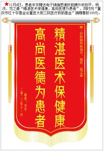 患者辛宇赠送电子锦旗感谢肝胆胰外科别平等人,并向医疗救助基金捐赠善款100元。-锦旗-患者心声-患者服务-重庆医科大学附属第三医院【官方网站】