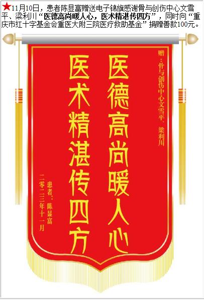 患者陈显富赠送电子锦旗感谢骨与创伤中心文雪平等人,并向医疗救助基金捐赠善款100元-锦旗-患者心声-患者服务-重庆医科大学附属第三医院【官方网站】