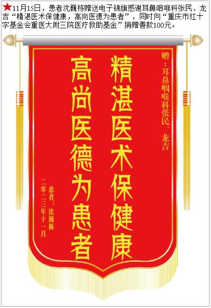 患者沈巍栋赠送电子锦旗感谢耳鼻咽喉科张民等人,并向医疗救助基金捐赠善款100元。-锦旗-患者心声-患者服务-重庆医科大学附属第三医院【官方网站】