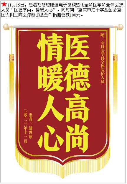 患者胡碧琼赠送电子锦旗感谢全科医学科全体以后人员,并向医疗救助基金捐赠善款100元。-锦旗-患者心声-患者服务-重庆医科大学附属第三医院【官方网站】