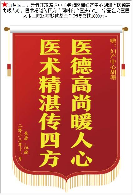 患者汪琼赠送电子锦旗感谢妇产中心胡珊,并向医疗救助基金捐赠善款1000元。-锦旗-患者心声-患者服务-重庆医科大学附属第三医院【官方网站】