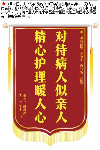 患者胡成德赠送电子锦旗感谢眼科谢琳等人,并向医疗救助基金捐赠善款100元。-锦旗-患者心声-患者服务-重庆医科大学附属第三医院【官方网站】