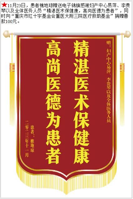 患者樵地琼赠送电子锦旗感谢妇产中心易萍,并向医疗救助基金捐赠善款100元-锦旗-患者心声-患者服务-重庆医科大学附属第三医院【官方网站】