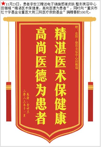 患者李世兰赠送电子锦旗感谢皮肤/整形美容中心田雅瑞,并向医疗救助基金捐赠善款100元-锦旗-患者心声-患者服务-重庆医科大学附属第三医院【官方网站】