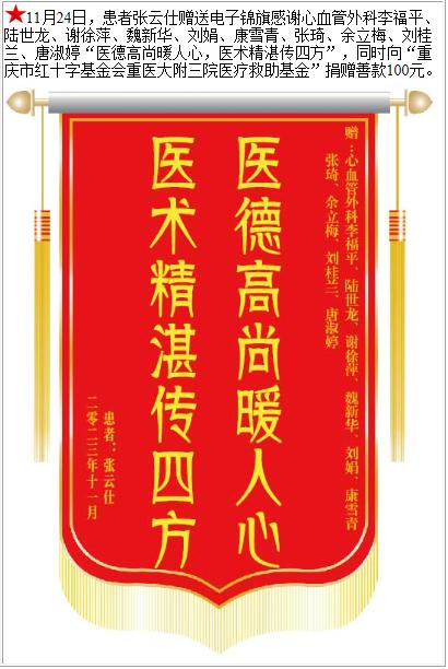 患者张云仕赠送电子锦旗感谢心血管外科李福平等人,并向医疗救助基金捐赠善款100元。-锦旗-患者心声-患者服务-重庆医科大学附属第三医院【官方网站】