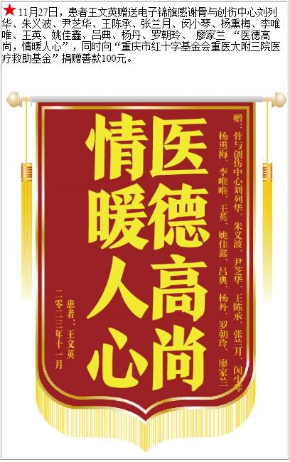 患者王文英赠送电子锦旗感谢骨与创伤中心刘列华等人,并向医疗救助基金捐赠善款100元。-锦旗-患者心声-患者服务-重庆医科大学附属第三医院【官方网站】