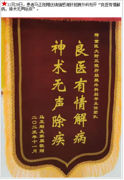 患者马正刚赠送锦旗感谢肝胆胰外科别平。-锦旗-患者心声-患者服务-重庆医科大学附属第三医院【官方网站】