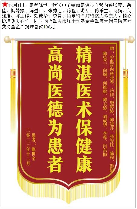 患者陈世全赠送电子锦旗感谢心血管内科张琴等人,并向医疗救助基金捐赠善款100元。-锦旗-患者心声-患者服务-重庆医科大学附属第三医院【官方网站】