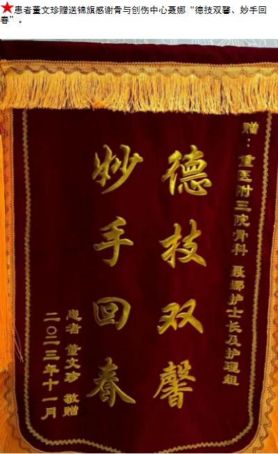 患者董文珍赠送锦旗感谢骨与创伤中心聂娜。-锦旗-患者心声-患者服务-重庆医科大学附属第三医院【官方网站】