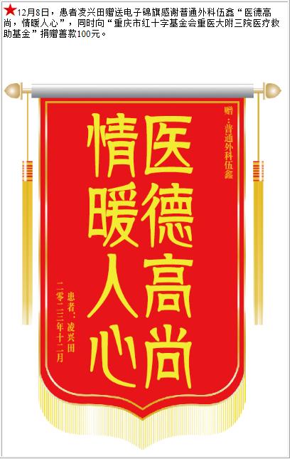 患者凌兴田赠送电子锦旗感谢普通外科伍鑫,并想医疗救助基金捐赠善款100元。-锦旗-患者心声-患者服务-重庆医科大学附属第三医院【官方网站】
