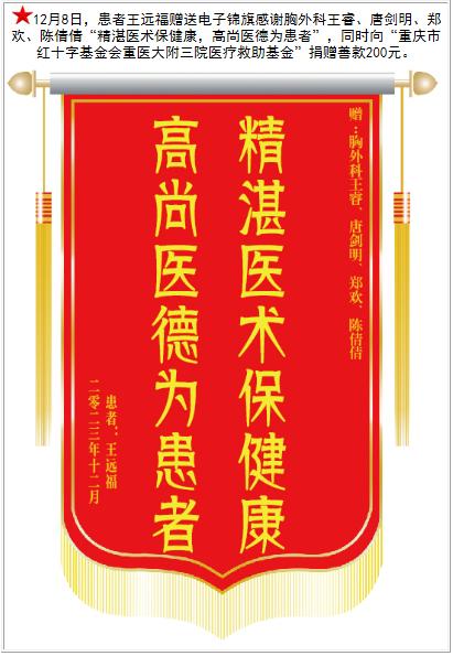 患者王远福赠送电子锦旗感谢胸外科王睿等人,并向医疗救助基金捐赠善款200元。-锦旗-患者心声-患者服务-重庆医科大学附属第三医院【官方网站】