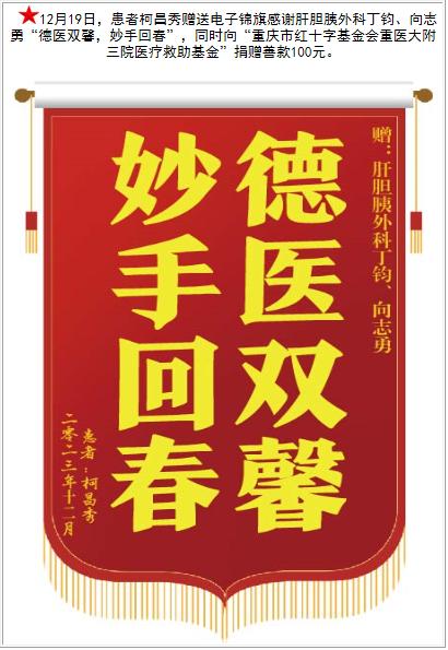 患者柯昌秀赠送电子锦旗感谢肝胆胰外科丁钧等人,并向医疗救助基金捐赠善款100元。-锦旗-患者心声-患者服务-重庆医科大学附属第三医院【官方网站】