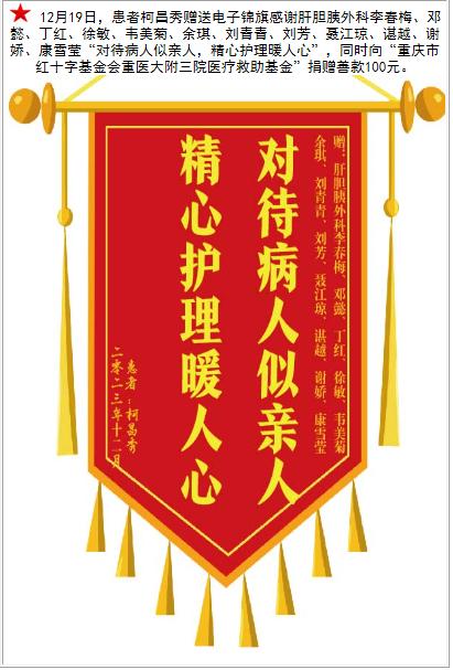 患者柯昌秀赠送电子锦旗感谢肝胆胰外科李春梅等人,并向医疗救助基金捐赠善款100元。-锦旗-患者心声-患者服务-重庆医科大学附属第三医院【官方网站】