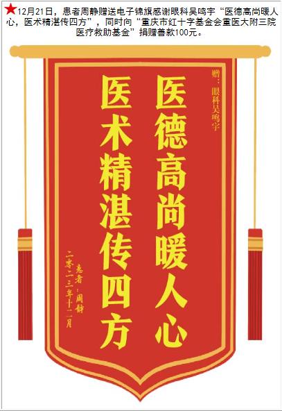 患者周静赠送电子锦旗感谢眼科吴鸣宇,并向医疗救助基金捐赠善款100元。-锦旗-患者心声-患者服务-重庆医科大学附属第三医院【官方网站】