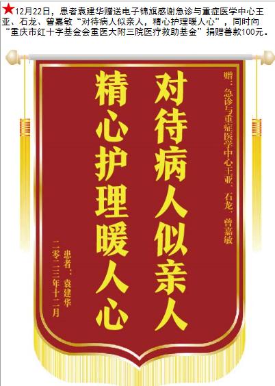患者袁建华赠送电子锦旗感谢急诊与重症医学中心王亚等人,并向医疗救助基金捐赠善款100元。-锦旗-患者心声-患者服务-重庆医科大学附属第三医院【官方网站】